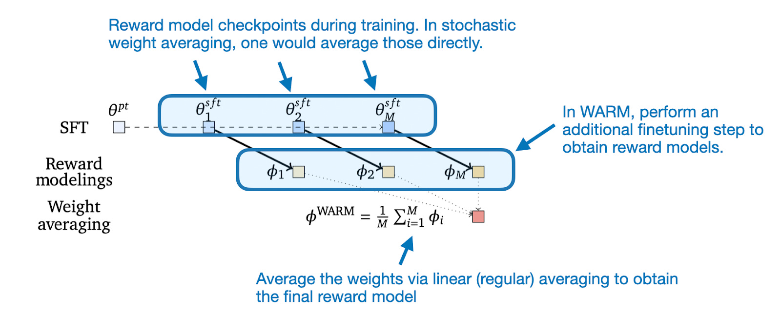How does WARM function? The method is fairly straightforward: similar to stochastic weight averaging, WARM averages the weights of multiple models (in this case, reward models), as depicted in the figure below.
