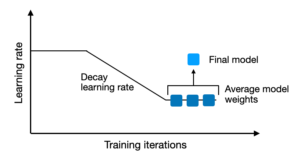 Since a model's training trajectory can be uneven, the strategy is to average the models towards the end of the training when the learning rate is low (if a scheduler is used), as illustrated in the figure above, where the training is nearing convergence.